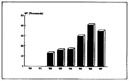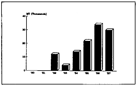 Green mussel farming started some 14 years ago in the Johore Strait. Production has increased slightly from 978 MT in 1983 to 1191 MT in 1988, an increase of 22% over the last 5 years. There are now about 5 hectares under cultivation, however total potential culture sites have been estimated at 300 hectares. Mussel spat are collected from the wild; spatfalls occur throughout the year with two major peaks. Main culture sites are presently located in the West Johore Strait. Depuration is not commercially practiced, however feasibility trials are being conducted by the Primary Production Department.