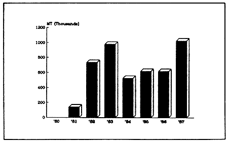 Coastal seafarming started in 1970 and originated from palisade trapping (kelongs) where fish are captured with lift nets. Grouper specimens which were of commercial size were sold immediately, while under-sized ones were stocked into fixed holding cages suspended from the kelongs or by floating wooden frames. These fish were raised to marketable size on trash fish trapped in the kelongs. Since the implementation of the Marine Fish Farming Scheme in 1981, aquaculture techniques have improved and larger and more sophisticated floating netcages came into operation. Production in 1987 was 129 MT.