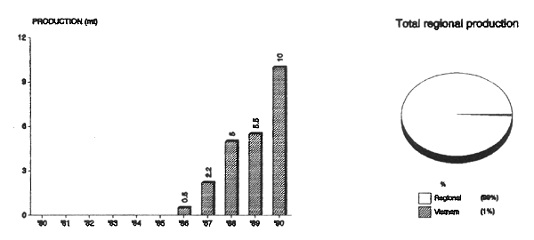 There are about 16 species of Gracilaria (known as Rong-cau in Vietnamese) distributed along the coastal region, including estuaries, brackishwater pond, canals of salt fields, mollusc beds, around mangroves or even on mud surfaces. Research programmes on the culture of G. verrucosa where first initiated in 1963, but its commercial culture was initiated in 1980. Culture of G. verrucosa is been practiced in numerous coastal ponds in the Central and Northern regions of Vietnam. From 1963–1973, general studies on the natural resources of this seaweed and its experimental culture were conducted. From 1973–1977, studies on G. verrucosa culture to provide raw material for agarprocessing were the main objectives. Seaweed culture and processing in Vietnam is becoming an important industry. Since 1987, the annual yield of Gracilaria has been about 700–800 mt (dried weight), of which 100–150 mt is used for agar-agar processing or for foodstuffs. The rest is exported to Asian countries. In general, levels of technology and productivity are low. Dried product of Gracilaria from culture was 250–300 mt in 1989 (⅓ of total annual production). Growing area for Gracilaria is around 350 ha. The potential area for Gracilaria farming is more than 10,000 ha in the north and central Vietnam. In 1988 a joint laboratory was established in Hai Phong City and operated by the Marine Products Research Institute and Institute of Fishery and Pacific Ocean Research (Vladivostok, USSR). Initial good results of this laboratory have been achieved. The Ministry of Fisheries has set the following targets: by 1990 there should be some 1,900 ha of culture area; dried product of Gracilaria 2000 mt; and agar product 100 mt. By 1995: 3000 ha, 4000–5000 mt, and 6000 mt, respectively.