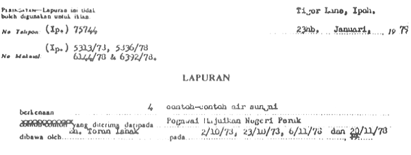2.3.1 At the moment the only form of pollution noticeable at site is the logging and minor mining activity being carried out in the upstream catchment. Further pollution is generally not expected if the development of the upstream catchment will be as outlined in Masterplan of the Trans-Perak Study.
