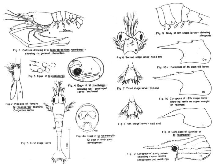 During the last decade, the giant freshwater prawn, Macrobrachium rosenbergii has emerged as the most talked/discussed species in the family of freshwater prawns. The breakthrough in the artificial breeding of the species done by Dr. S.W. Ling, then an FAO Regional Fish Culturist in Asia and the Far East in 1961, has attracted a number of biologists. Many indepth studies have been done and are still being undertaken in respect to the growth rate, ecology, mode of breeding (migration movement), feed and feeding habits, genetics, etc. aim towards commercial production of post larvae in hatchery and marketable prawn from the growout ponds.