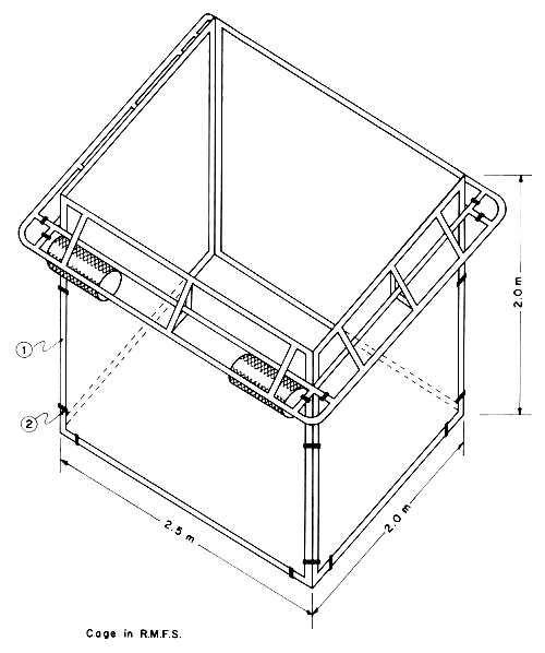 Floatation of the cages is provided by cylindrical shaped styrofoam, 30 × 60 cm in diameter and 60–120 cm in length or box-shaped styrofoam (50× 50 × 100 cm). Plastic containers have also been used as floats for demonstration purposes.