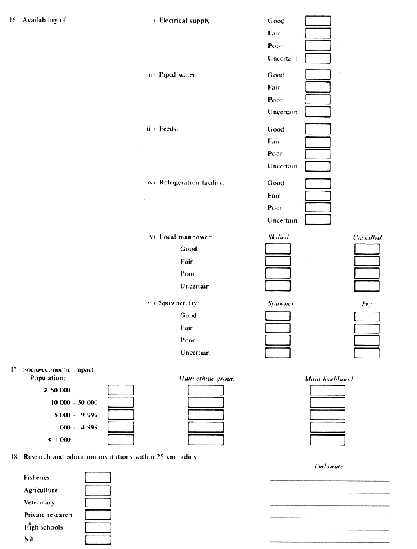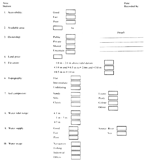 For the future, practical contributions in fields such as application of modelling trophic status in relation to nutrient loading (e.g., Rast and Lee, 1978), a better understanding of interactions of water chemistry in coastal systems such as mangroves (e.g., Boto and Bunt, 1981), as well as practical modelling of water quality conditions in fishponds (e.g., Romarie Boyd and Collins, 1978; Krant, Motzkin and Gordin, 1982), if integrated, could considerably aid in predicting the suitability of a site by inputting seasonal and long-term weather data. However, such forecasting for site selection purposes is probably still far off, and meanwhile use will have to be made of less sophisticated methods such as those proposed below.