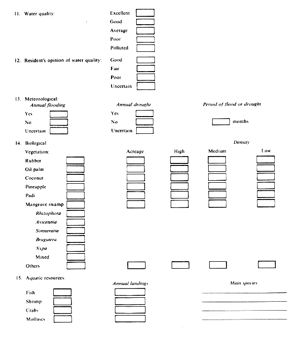 Two activities are recommended. Local government (or higher) authorities involved with development and planning should be interviewed to enquire about the kinds and pace of development activities which could influence the future suitability of the site. Secondly, development patterns in the vicinity of the proposed site should be studied. Large-scale maps can be used to determine the drainage basin in which the site is located, and hence the geographical area from which landward dangers to the site might stem. In the former, local authorities will have a good idea of the development activities planned or being sought for the future. These could include local light or heavy industries. expansion of various kinds of agriculture, or plans for expansions of urban centres or ports. Something as simple as trends in population in the district in which the proposed site is located, if available, may give valuable insight into future development trends and their consequences, such as domestic pollution loads. Interviews with local businessmen and personal observations of the distribution of agriculture and population centres could constitute useful familiarization activities before engaging busy officials in interviews. Help may also be obtained, for some districts, by consulting economic geographers, or their publications.