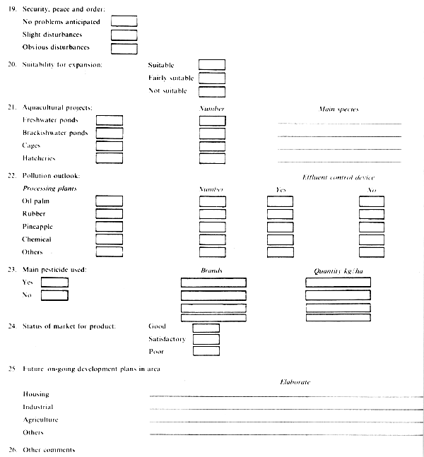 It should be noted, however, that aquaculture may not succeed in the entire area. Success of aquaculture projects depends largely on the proper selection of the site to be developed into ponds. Prior to the site selection, various environmental parameters should be taken into consideration. These are, for instance, climatic conditions, tidal behaviour, soil and land quality, vegetation, water quality and pollution problems.