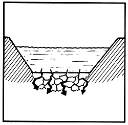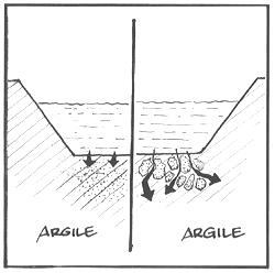 ![]() | Les pertes d'eau par infiltration à travers le fond d'un nouvel étang rempli pour la première fois, sont plus importantes que celles estimées à partir de la composition du sol. Cela est dû à la structure du sol qui, étant encore bonne (ouverte), laisse traverser l'eau. |