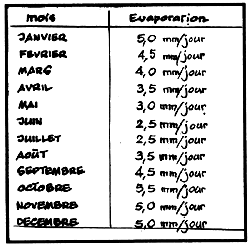 ![]() | Afin de connaître le taux d'évaporation d'un site piscicole, il faut déterminer le taux d'évaporation journalière du site. Avec ces données, on peut calculer les pertes d'eau par mois. En pratique, on se renseigne auprès de la station météorologique la plus proche pour obtenir les renseignements sur l'évaporation de la région. Le tableau ci-contre représente, à titre indicatif, les taux d'évaporation d'une station météorologique sur les Hautes-Terres malgaches. |