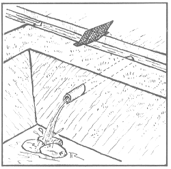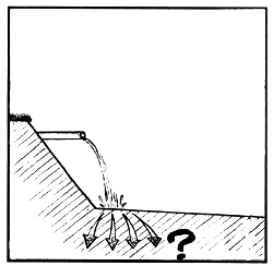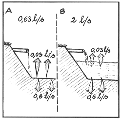 ![]() | Si le débit d'eau du canal d'amenée est 0,63 l/s ou moins, toute l'eau sera perdue par infiltration et/ou par évaporation (cas A). En conséquence, pour pouvoir mettre sous eau cet étang, le débit d'eau doit être supérieur à 0,63 l/s (cas B). |