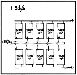correspond à un volume d'eau d'une profondeur de 30 cm (= 0,3 m). Par exemple, pour un étang de 5 ares ou 500 m2, il faut arroser : 500 m2 × 0,3 m = 150 m3 = 150.000 litres. Avec un débit d'eau du canal d'amenée de 21/s, il faut faire couler l'eau pendant : 150.000 1 : 2 l/s = 75.000 sec. = 21 heures. |