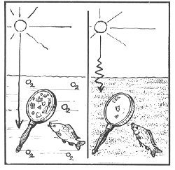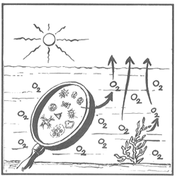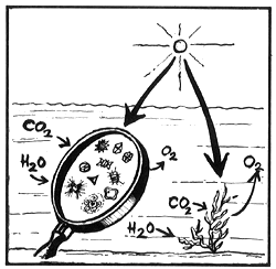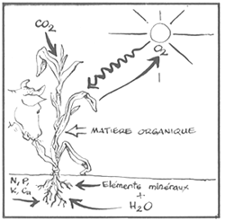 carbonique (CO2). On a vu que ce sont les organismes végétaux contenant de la chlorophyle qui produisent la matière organique par la photosynthèse. Ce processus consomme du gaz carbonique (CO2) et produit de l'oxygène (O2). Dans le même temps, tous les organismes vivants consomment de l'oxygène par la respiration et secrètent du gaz carbonique comme déchets du métabolisme. Dans la nature, il existe un équilibre entre la production et la consommation de l'oxygène et du gaz carbonique. |