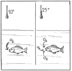 température optimale). En saison froide, quand la température de l'eau est basse, ce poisson est peu actif, ses besoins alimentaires moindres ou même nuls, sa croissance, faible ou nulle ou même négative (= température non optimale). |