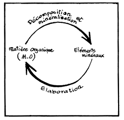 ![]() | Le cycle qui transforme les éléments minéraux en matière organique (MO), qui à son tour est transformé en éléments minéraux par minéralisation, est le cycle de la matière organique. Ce cycle assez complexe peut être résumé comme suit : les éléments minéraux, en présence de lumière, sont transformés par les végétaux en matière organique, ces derniers peuvent être consommés par des organismes animaux suivant une chaîne alimentaire plus ou moins longue. Les déchets et cadavres seront décomposés et minéralisés par des bactéries, et les éléments minéraux seront libérés. |