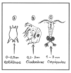 selon trois classes, en ordre croissant de tailles. On distingue : - les rotifères (A) ; - les cladocères (B) ; - les copépodes (C). Le zooplancton forme un excellent aliment pour beaucoup d'espèces de poissons surtout au moment du stade larvaire. Cependant, les plus grands copépodes sont les prédateurs d'oeufs, de larves et même d'alevins. |