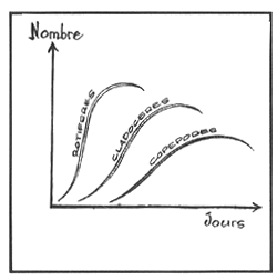 ![]() | Il est important de connaître le dynamisme de développement des classes composant le zooplancton. Ainsi, après la mise en eau d'un étang bien fertilisé, on observe pendant les premiers jours un bon développement de la population de la classe des plus petits zooplanctons: les rotifères. Ce n'est qu'après une semaine que la population des cladocères atteint son optimum et de même, après une dizaine de jours pour la population des copépodes. |