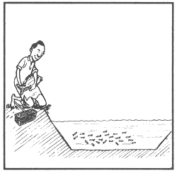 ![]() | Notons que, si l'on a plusieurs étangs, on n'a pas besoin de les remplir tous en même temps. Remplissezen un d'abord, puis un autre selon vos disponibilités en eau et selon votre calendrier de production. |