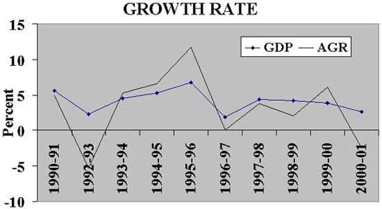 The agricultural sector in Thailand, although declining in relative terms, still has a significant role in the national economy. During the last two decades, GDP in the agricultural sector, at 1988 prices, increased from 184,576 million baht in 1980 to 298,060 million baht in 2000. Its contribution to the national economy, on the other hand, decreased from 20.2 percent to 10.0 percent. The agricultural population also increased from about 30 million to 37 million while its proportion dropped from about 70 percent to about 60 percent.