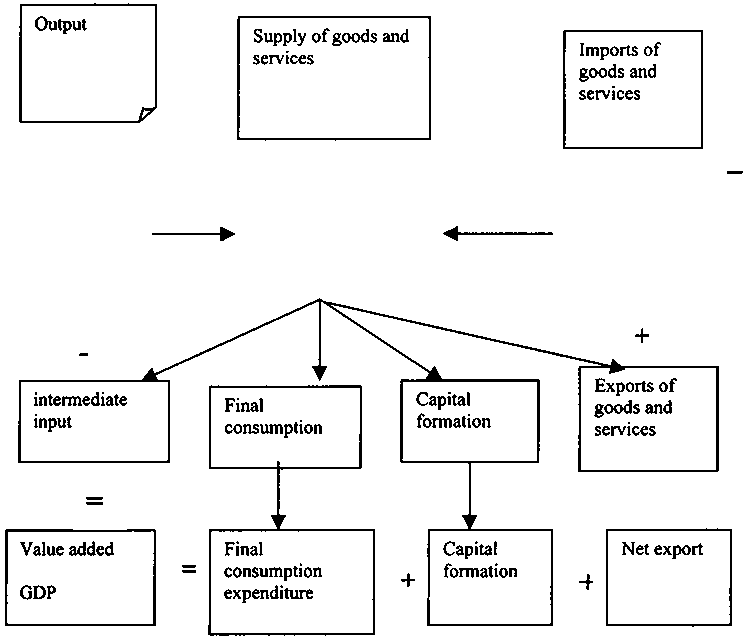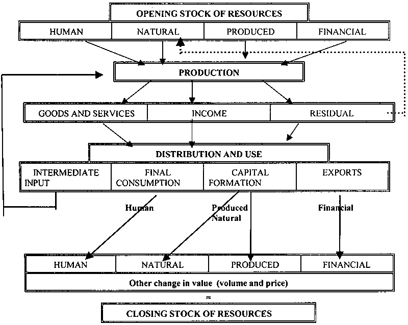 The above diagram indicates the resources, which the country has in stock, and the flow in which these resources are put to use to attain societys goal. Opening and closing stocks of resources reflect the quantity or the value of the resources at a certain point in time - the beginning or ending of a long term, medium term plan, or short-term plan. This could also be reckoned at the beginning or ending of an accounting year or at any point in time when stock taking is desired.