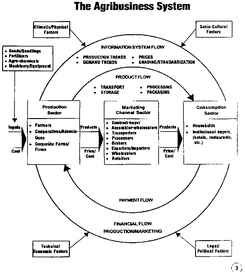 Agribusiness within this context, therefore, covers the production in these economic sectors for the market. In a wider scope it could refer to the integrated activities which involve the production, processing, marketing and consumption of agricultural products. As one of the major groups of production activities in the economy, it has links with other economic activities. It is also an integral part in the compilation of national accounts although its articulation might not be explicit. The System of National Accounts revised in 1993 provides for satellite accounts that allow for modification of the configuration of the accounts to enable specific analysis without deviating from the central framework. The sectors covered in agribusiness could be expanded to allow for more in-depth analysis without losing its links with the overall framework of economic analysis.