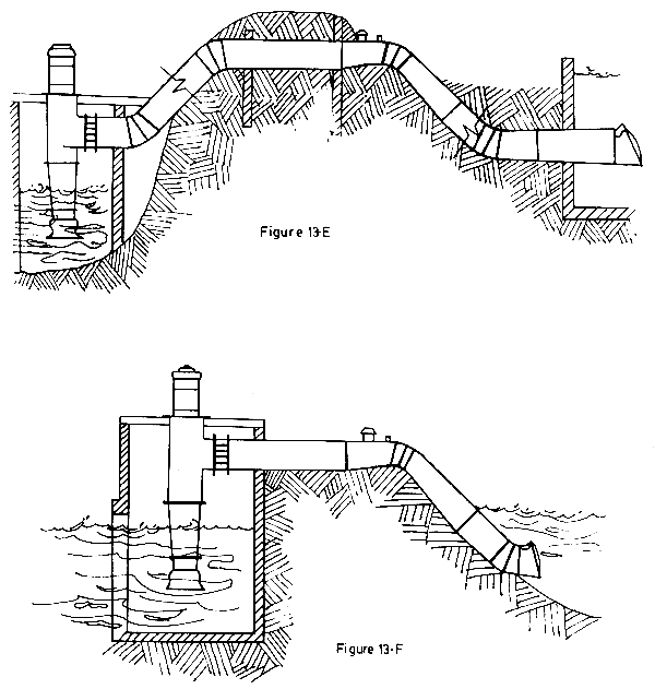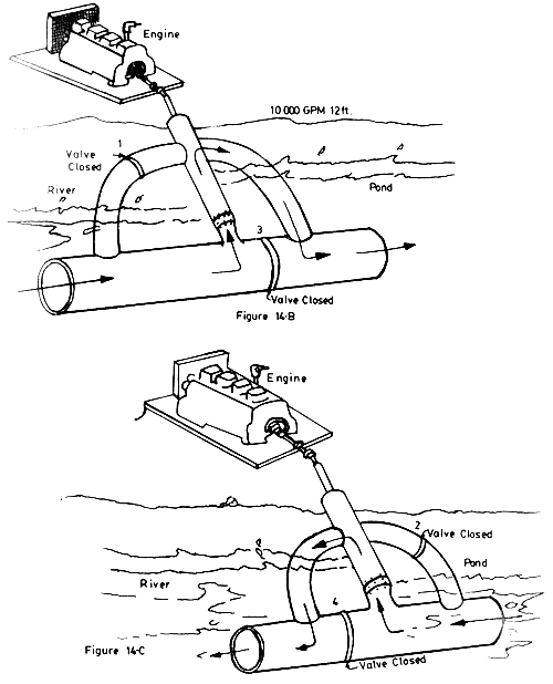 Units are located near pond bottom in a horizontal position. A pump drawing suction from near the pond centre supplies the water to the exhausters.