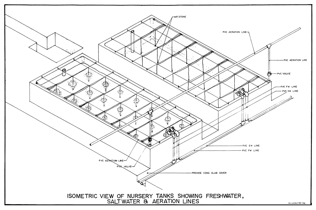 Isometric View of Nursery Tank Showing Freshwater, Saltwater and Aeration Lines.