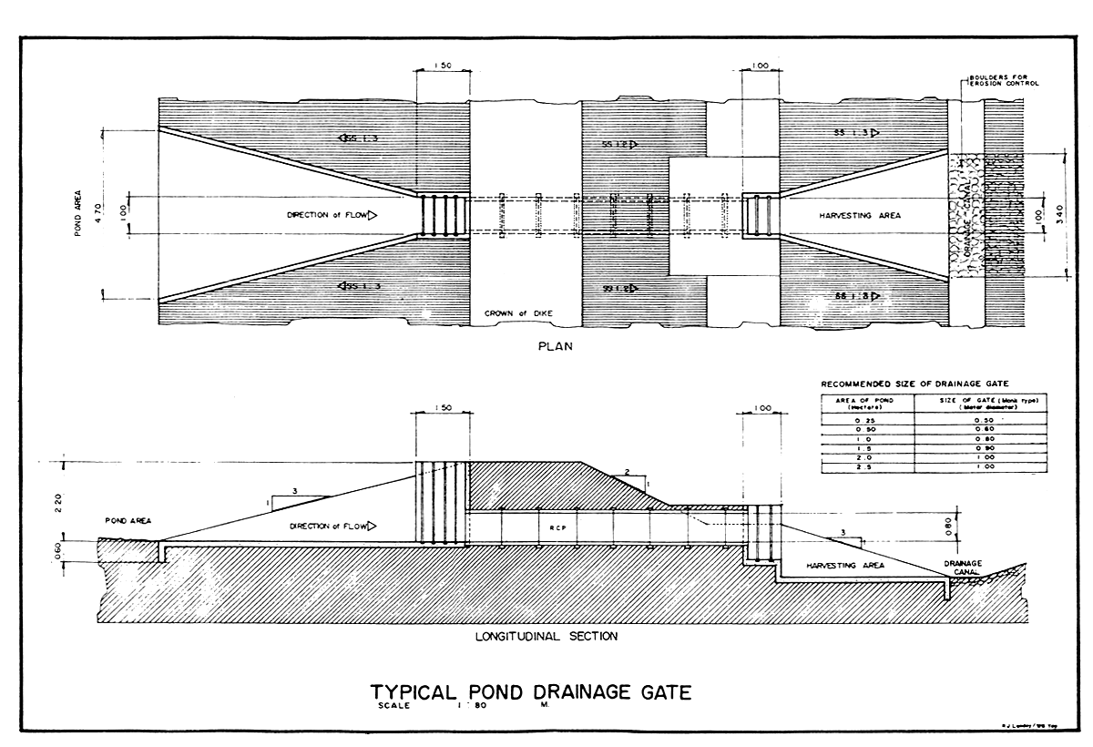 Size of Drainage Gate - must be able to drain 80% of the total pond water in 8 to 10 hours time and the remaining 20% in 3 to 4 hours.