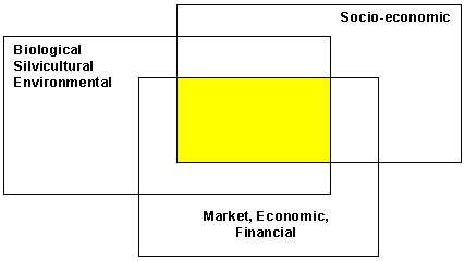 This scenario (shown as shaded) is essentially a compromise between the three different considerations and their associated criteria which provides contractors/concessionaires, local forest users, and the government with a sustainable management option for that particular location. The rationale for the three major considerations in general, and the socio-economic considerations in particular, is not simply welfare of philanthropic, but relates to the need to consider all the aspects to ensure that sustainable forest use is developed successfully.