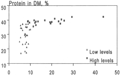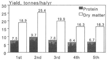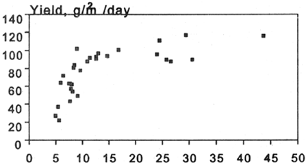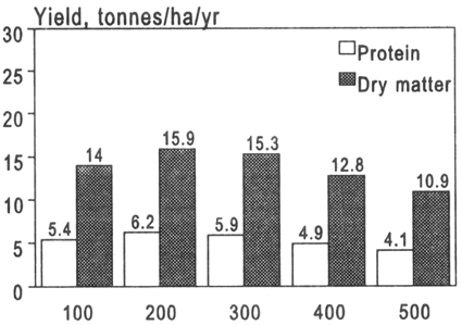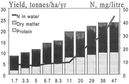 At the low levels of addition of effluent, protein yields of duckweed increased from 1.8 to 5.4 tonnes/ha/yr when N concentration in bin water rose from 5 to 10 mg/litre. At the high levels of addition of effluent (20–40 mg N/litre of bin water), protein yields of from 7.7 to 10 tonnes/ha/yr were obtained (Figure 5). In the 11–25 mg/litre range of N in the bin water, yields of duckweed were still around 6 tonnes/ha/yr. As a generalisation, it seems that protein yields from duckweed of between 6 and 10 tonnes/ha/yr can be obtained when the N content in the water is in the range of 10–30 mg/litre.