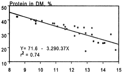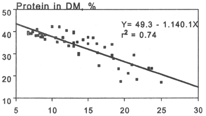 Rodriguez and Preston (1996) reported a similar relationship between root length and protein content (Y = 56.3 - 1.49±0.15X).