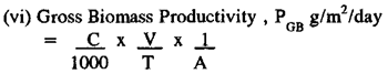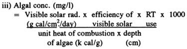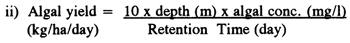 where C = dry weight of algae (mg/l), V = pond volume (litre), T = detention time (day), and A = surface area of pond (m2); and