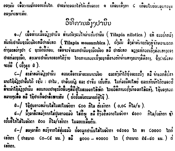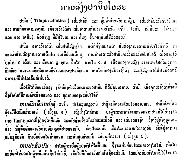 Pa nin (Tilapia nilotica) is a good fish for culture. It breeds in ponds and feeds voraciously on most of the natural food (plankton, bottom biota, vegetation etc.) present in ponds prefers vegetable food; it grows fast and its meat is tasty.