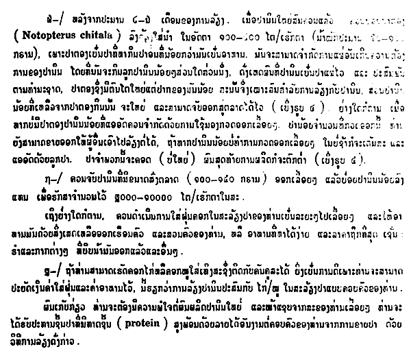 6. After about 2 to 3 months of culture, when pa nin grow quite big, stock pa thong (Notopterus chitala) at the rate of 100–200/ha (average weight 60–100g) in the pond. Pa thong, a minor predator, will control the population of pa nin by eating the small pa nin produced as a result of natural breeding. Pa thong which has a big body but a small mouth checks overpopulation of small pa nin in the pond. The fry which escape predation grow faster and reach the marketable size (Fig. 4). However, when pa thong is not available, the overpopulation of small panin can be kept under check by regular netting and removal of small-sized fish. These fry, early fingerlings could be sold to other farmers. If small size pa nin are not removed regularly, the pond will soon get overpopulated and the fry will get stunted resulting in poor production (Fig. 5).