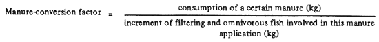 The manure-conversion factor is a new concept developed directly from integrated fish farming. This indicator varies with manure quantity, ecological conditions and technical management. Food-conversion factor, food efficiency, and manure-conversion factor all represent the relationships between the input of feed and fertilizer and the output of fish, livestock and fowl.