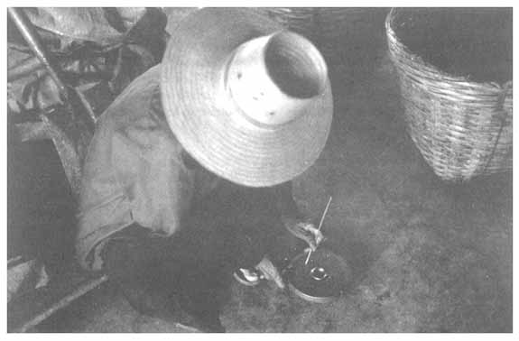 A worker cleans the mincer die-plate used for moist extrusion prior to sun-drying.