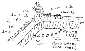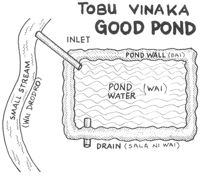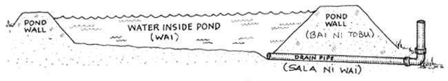 NA TOBU TAUCOKO E DODONU ME NA DUI TIKO NA KEDRA SALA NI WAI KI LOMA KEI NA KEDRA SALA NI WAI KI TUBA. NA TOBU LAILAI KA DAU MAROROI KINA NA LUVE NI IKA E NA RAWA NI KELI VAKAVOLEKA KI NA DUA NA TOBU LEVU SE DUA NA VANUA VAKAVOLEKA. EVERY POND MUST HAVE ITS OWN INLET AND DRAIN. A SMALL POND TO HOLD THE YOUNG FISH CAN BE PUT NEXT TO A BIG POND OR ANYWHERE NEARBY. | |