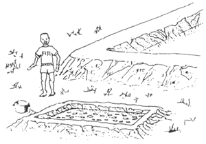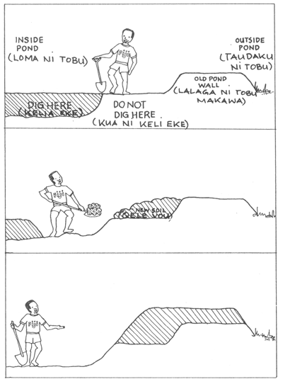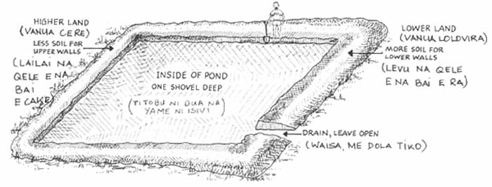 NI SA VAKASAVASAVATAKI OTI NA VANUA, KELIA SOBU E NA I VAKARAU NI DUA NA YAME NI I SIVI NA KENA TITOBU E NA LOMA NI TOBU KECE SARA. KA ME NA VAKA TU OQO NA KENA I RAIRAI. AFTER THE LAND IS CLEARED, DIG DOWN ONE SHOVEL DEEP EVERYWHERE INSIDE THE POND. THEN THE POND SHOULD LOOK LIKE THIS. | |