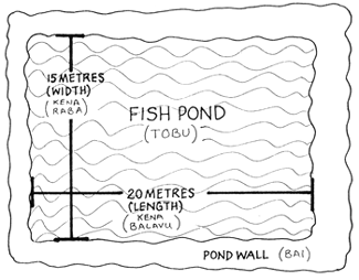 NA BAI NI TOBU E DODONU ME TAUTAUVATA VAKAVINAKA NA KEDRA CERE, NA BOTONA ME SAVU SOBU VAKAMALUA KI NA VANUA E NA VAKADRODROI KINA NA WAI.NA TITOBU NI WAI E DODONU ME 3 NA FITI. NA I VAKARAU NI DUA NA TOBU E DODONU ME RAUTA NI 15 NA MITA NA KENA RABA KA 15 NA MITA NA KENA BALAVU. A POND HAS LEVEL WALLS, AND THE BOTTOM SLOPES DOWN TO THE DRAIN. THE WATER SHOULD BE 3 FEET DEEP. A POND SHOULD BE ABOUT 15 METRES WIDE AND 15 METRES LONG. | |