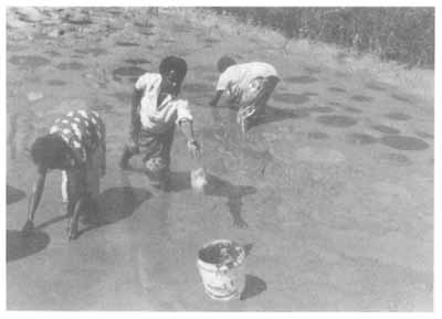 The number of fish that you can put into your pond depends upon the size of the pond. To learn the size of your pond, use a measuring tape to measure the length and width in metres. Multiply these two numbers to get the size of your pond (the number of square metres). The first time that you raise fish, you should put in the same number of fish as the size of your pond (the number of square metres), or a few more. If the fish grow to a good size, then you can put more fish in the next time. Eventually, you may be able to put in twice this number of fish or more. WHAT FISH TO USE If you get your fish from the Fisheries Department, then you will know that you are getting the right type of fish and the number that you ask for. If you use your own fish or some from another farmer, make sure that they are young fish and that they are all about the same size. The fish should be one to two months old. If they are older than this, they will not grow well. The best way to know the age of young fish is to know when they were first seen in the pond. You must carefully count how many fish you put into the pond. FEEDING THE FISH It is very important that you feed your fish twice each day so that they will grow quickly to a large size. If you do not feed every day, the fish will always stay a small size. |