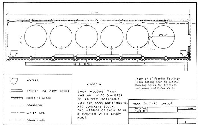 The facility is heated by two 75,000 B.T.U. kerosene forced-air heaters (Appendix I). The interior temperature must be maintained at 70°F or above. Rana catesbiana (and Rana tigrina?) does not feed at temperatures below 70°F.
