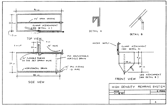 A high density rearing system has been designed and tested by Culley et al. (1977). Each rearing unit of a longitudinal V-shaped 120-liter Fiberglas reservoir (Appendix III) is equipped with a full-length horizontal drain pipe for waste removal, and a vertical standpipe to maintain desired water level. Each tank will receive a rearing basket 64cm × 25cm × 20cm. The water depth in the rearing basket should be 15cm. The sides of the rearing basket are of nylon screen, and the bottom of 0.32cm mesh, allowing the feces to fall to the horizontal drain. Water is delivered to the basket by a tee-jet nozzle, producing a fan-shaped spray.