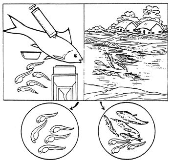 - It is now possible to induce major carps to spawn in confined water like pond, tanks, hatchery etc.