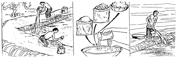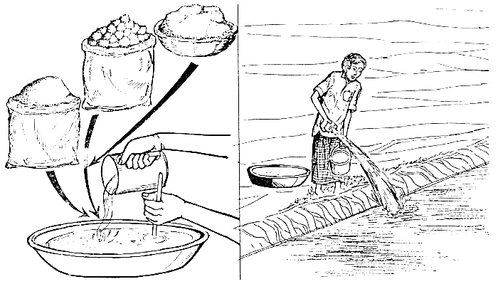 All three manures properly mixed in 3 times of water, stayed overnight and sprayed to pond surface in the morning at about 9 or 10 O'clock.