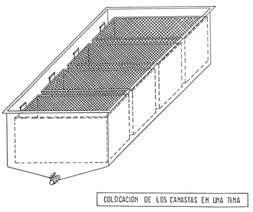 Después, abrir las válvulas de salida de las tinas, una después de la otra, con una persona en la Nodreza trasladando la manguera de salida en la mitad superior de la Nodriza, a partir de una canoa (no se debe caminar dentro del agua). Vaciar totalmente las tinas ayudando a vaciarlas por medio de” baldes con agua de la Nodriza.