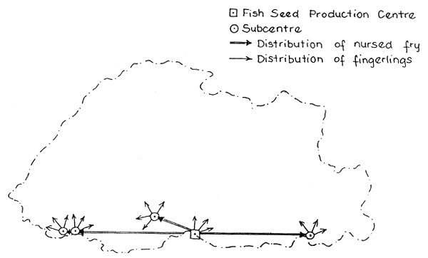 Distribution of fingerlings from the Centre and from sub-centres can begin about 1 or 1 ½ months after reproduction. Distribution is as follows: