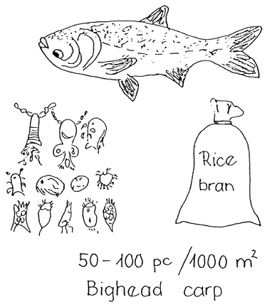 during second half of filling the pond, about 10 kg superphosphate and 10 kg urea/1 000 m2 should be poured into the inlet of the pond;