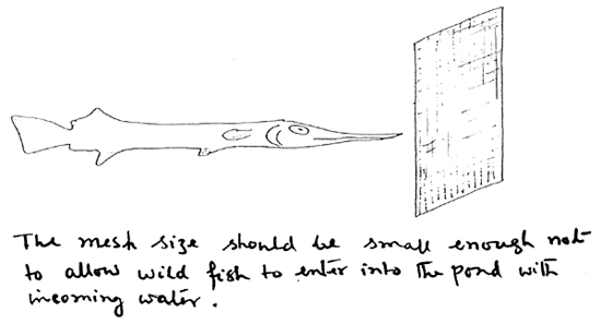 the pond must be filled using a metal mosquito net across the inlet monk to prevent the entry of wild fish. Filling one pond (about 0.3 ha) takes 2–3 days. Inlet nets have to be cleaned continuously during the filling;