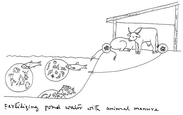 In order to produce adequate amounts of natural food, the pond should be fertilized daily. Methods have been developed to have enough manure in the pond water without daily fertilization; this can be done through integrated fish-farming. Integrated fish-farming is the culture of terrestrial animals (pigs, ducks, chickens) near or above the fish ponds; their droppings fall into the pond serving as manure.