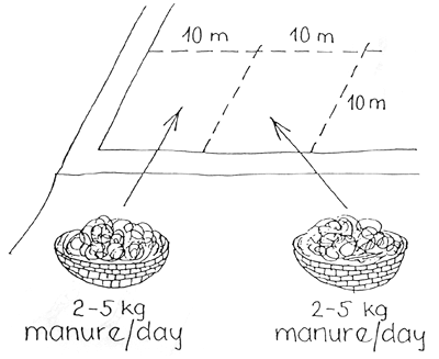 spread 500–700 kg cattle manure/1 000 m2, and if there was over-production of plants, these must be ploughed into the soil;