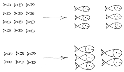 When a pond is stocked with a lower quantity of fish, they grow faster, because they have more natural food; but the total production of the pond will not be high. When the pond is overcrowded, the fish grow much more slowly due to the fact that they have less natural food (it may not be possible to supplement the necessary natural food with artificial feed, as it does not contain all the materials needed for optimum fish growth.