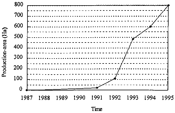 Fig. 2. The production-acreage devoted to growing cut flowers in Yunnan Province during the period from 1987 to 1995.