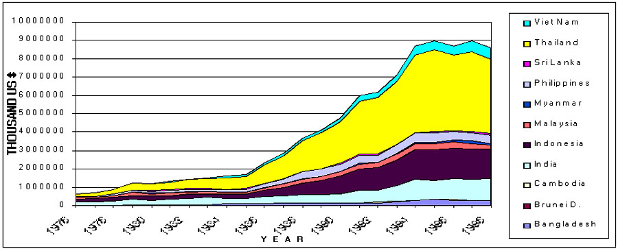 The fisheries sector plays an important role in Asia as a source of protein. In some coastal communities it is the only cheap source of animal protein. The sector also provides employment opportunities and foreign exchange earnings. Asia is one of the main suppliers of the global fish market and one of the main fish importers, to Japan and Korea in particular. Thailand has been the leader in fish export in Asia and the number one world exporter for a number of years. The amount of export from the developing countries in South and Southeast Asia bordering the Eastern Indian and Western Central Pacific oceans has steadily increased in the last three decades. The export value had increased from US$0.2 billion in 1976 to nearly US$9 billion in 1998, a 45-fold increase in two and a half decades (Figure 5). This extraordinary increase is largely due to the rapid rise of shrimp exports as a result of the fast development of the shrimp culture sector in the region.